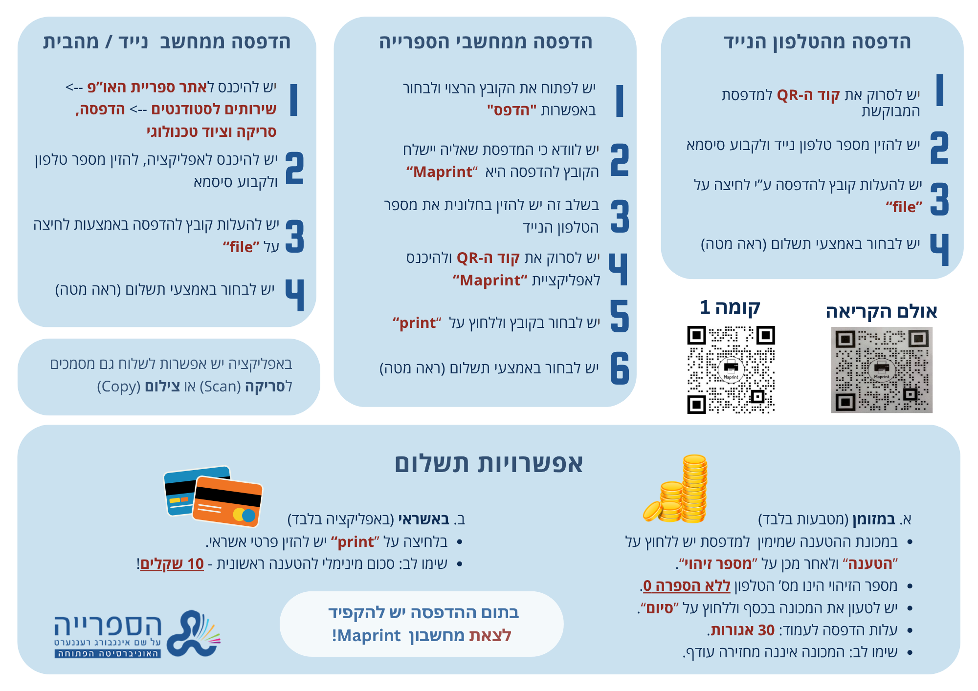 לשימוש במדפסת הספרייה בקומת הכניסה יש ללחוץ כאן.