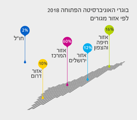 אזור מגורים: 60% מהבוגרים גרים באזור המרכז, 16% באזור חיפה והצפון, 12% באזור ירושלים, 10% באזור הדרום ו-2% מתגוררים בחו"ל.
