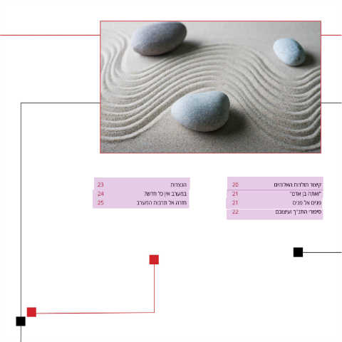הנצרו ת 23 קיצור תולדות האלו הים 20 במערב אין כל חדש ? 24 "ואתה בן אדם " 21 חזרה אל תרבות המ ערב 25 פנים אל פנים 21 סיפורי התנ"ך ועיצו בם 22